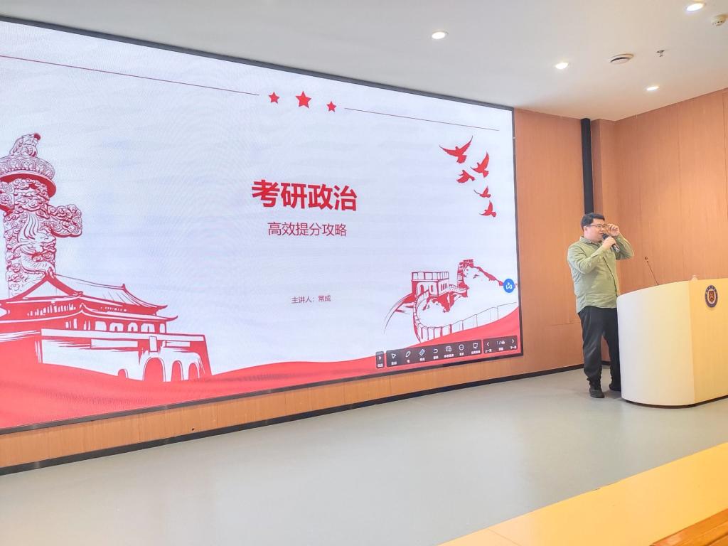 常成讲师首先结合近年考研政治真题分数段分布、题型结构变化趋势,精准剖析了马克思主义基本原理、习近平新时代中国特色社会主义思想概论等六大科目的核心考点、高频考点与命题规律,帮助学子厘清备考重点、规避复习盲区。针对考研政治中记忆型与应用型两类核心考题,讲师分享了图示串联记忆法、关键词提炼法、考点逻辑树构建等实用技巧,通过典型真题案例现场演示选择题“排除法 + 因果分析法” 的答题逻辑,详解分析题 “材料定位—考点对接—框架搭建 — 语言组织”的四步拆解方法,让抽象的备考思路转化为可直接落地的实操方案。同时,围绕时政热点与考点深度融合的命题特点,讲师给出了“基础巩固—强化刷题—冲刺背诵—模拟实战”的分阶段复习规划,指导学子科学分配冲刺期时间,实现精准发力、高效提分。