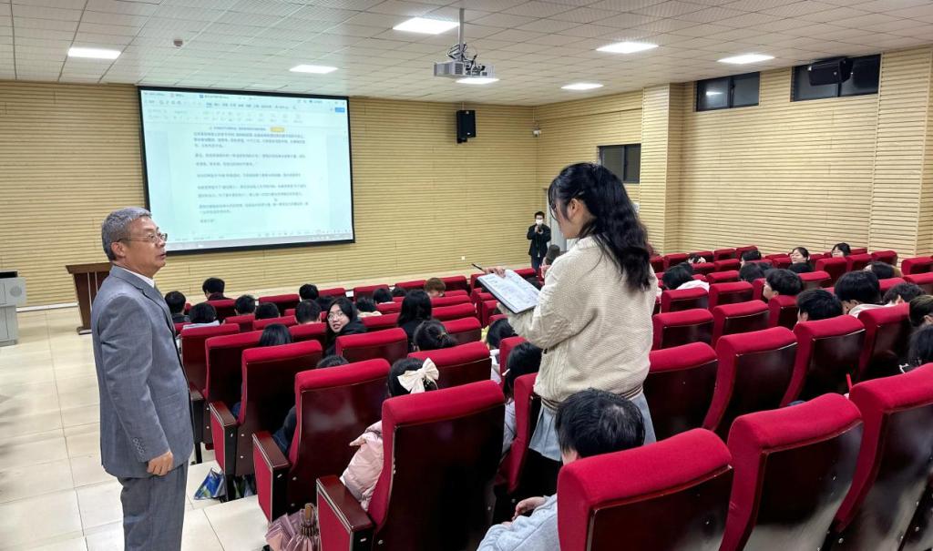 在互动环节,同学们踊跃提问,王建宇教授逐一回应。谈及“如何践行服务精神”时,他表示,为人民服务并非遥不可及,而是体现在日常点滴:孝敬长辈、关爱亲友、与师生互帮互助、摒弃不良习惯,在不断提升自我的过程中践行初心。当被问及“大学生如何坚守初心”时,他寄语同学们要认清自身定位、回归学生本色,牢记入学时的初心,脚踏实地、精益求精,在成长中不断坚定前行的方向。